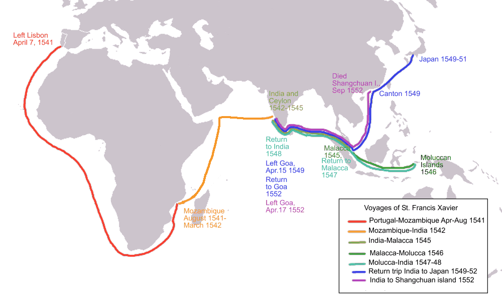 Mapa de los siete viajes de san Francisco Javier entre 1541 y 1552, con rutas diferenciadas por colores que indican sus desplazamientos por África, India y el sudeste asiático.